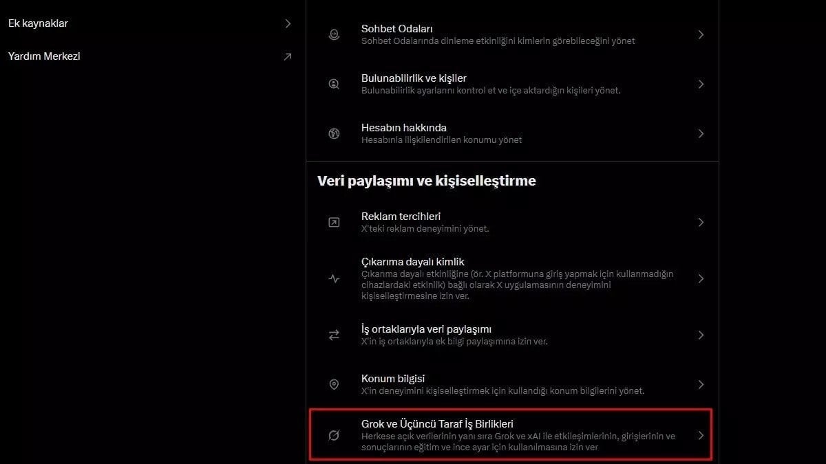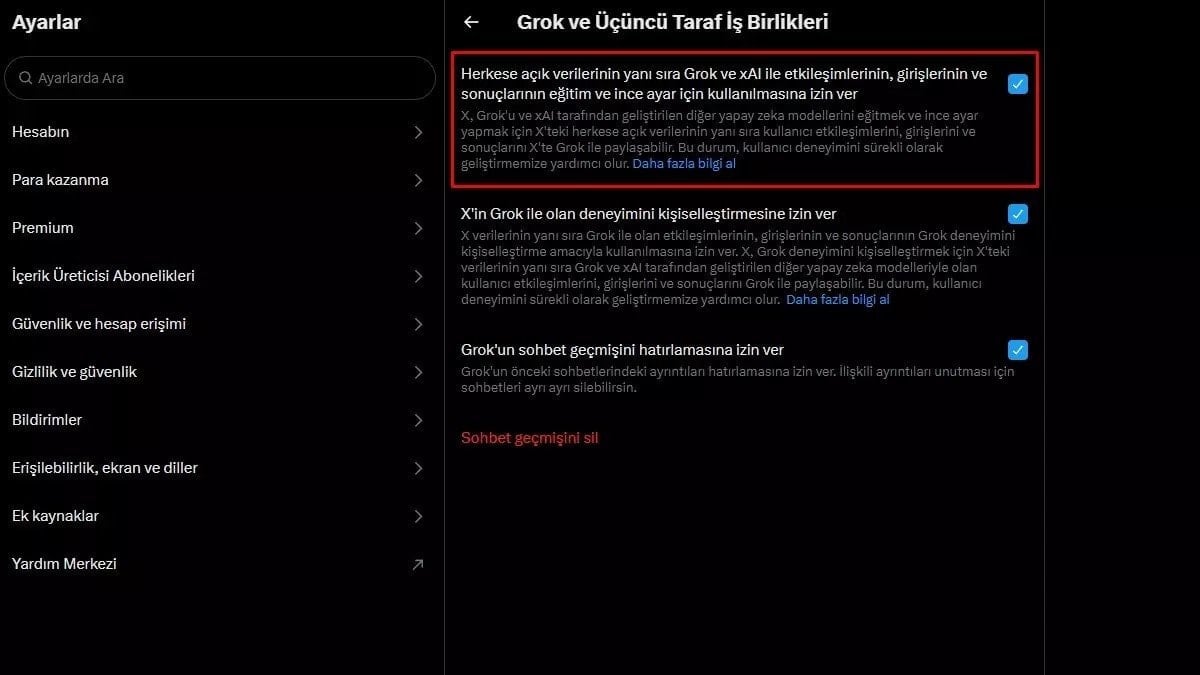 X’in ayarlar menüsünde bulunan seçenek, herkese açık verilerinizle birlikte Grok ve xAI etkileşimlerinizin eğitim ve “ince ayar” amacıyla kullanılmasına izin veriyor. Bu izin verildiğinde, paylaşımlarınızın Grok ile ilişkilendirilme olasılığı artıyor.