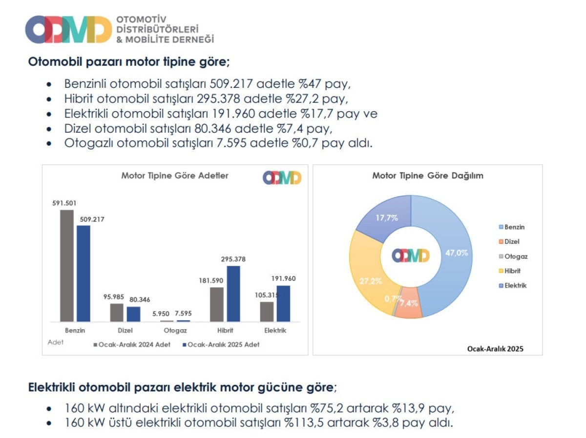 Motor tercihlerinde benzinli araçlar hala popülerliğini korurken, hibrit modeller %27,2 pazar payına ulaştı. Elektrikli araçlar 191 bin 960 adetlik satışla üçüncü sırada yer alırken, dizel araçların payı %7,4 seviyesinde kaldı.