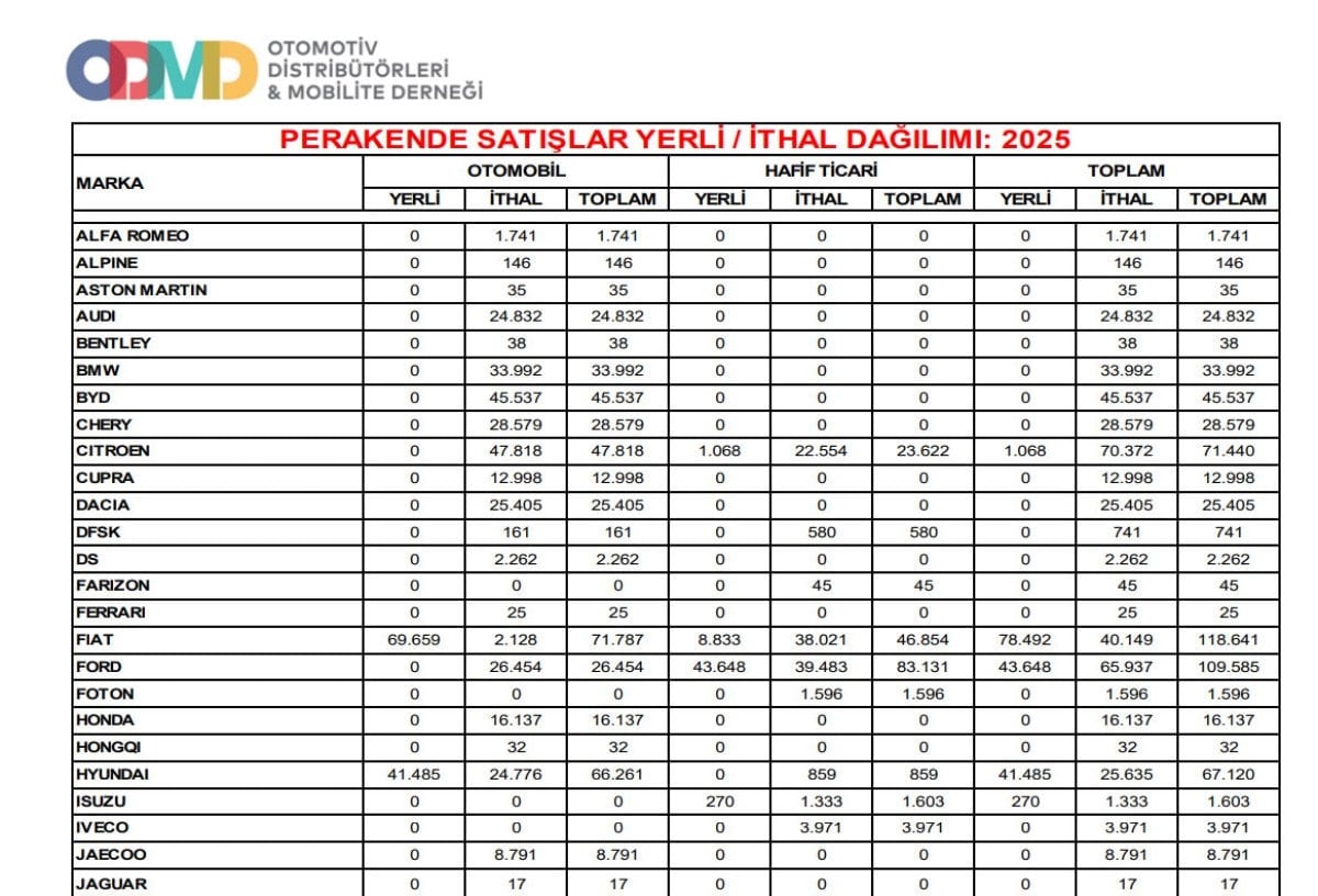 Otomotiv Distribütörleri ve Mobilite Derneği tarafından açıklanan verilere göre Türkiye otomobil ve hafif ticari araç pazarı, 2025 yılını son 10 yılın rekorunu kırarak tamamladı.